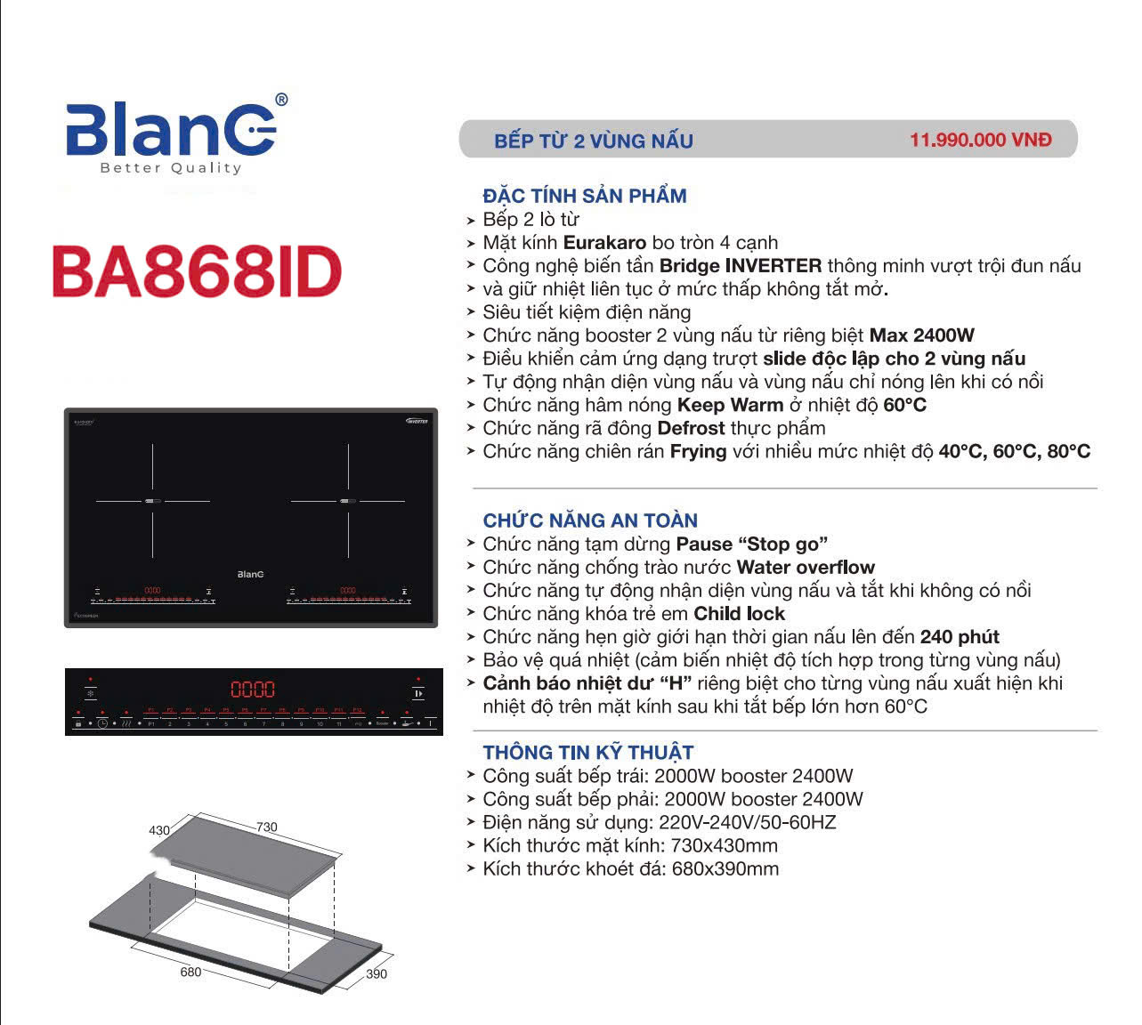 Việc nắm rõ kích thước là rất quan trọng để đảm bảo tính thẩm mỹ cho không gian bếp. Bếp từ đôi BlanC BA 868ID có kích thước mặt kính là 730 x 430 mm, phù hợp với hầu hết các không gian bếp hiện đại tại Việt Nam.