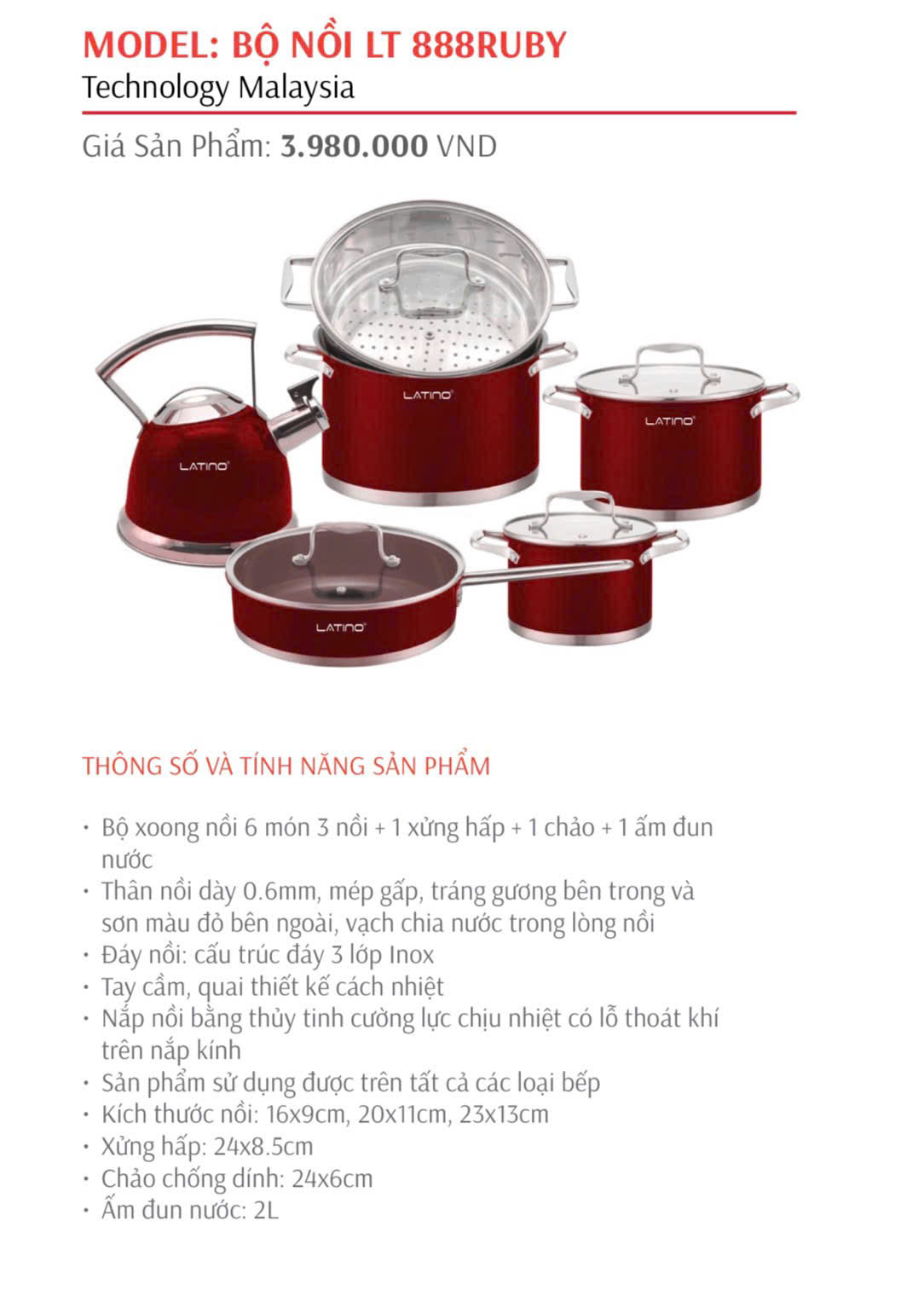 Bộ Nồi LATINO LT 888RUBY không chỉ là một bộ nồi đơn thuần mà còn là một điểm nhấn thẩm mỹ cho gian bếp của bạn. Với chất liệu cao cấp, thiết kế thông minh và hiệu suất nấu nướng vượt trội, bộ nồi này chắc chắn sẽ trở thành người bạn đồng hành đáng tin cậy trong mỗi bữa ăn gia đình. Hãy sở hữu ngay Bộ Nồi LATINO LT 888RUBY để trải nghiệm sự khác biệt và tận hưởng niềm vui nấu nướng!
