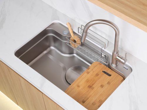 Giỏ đựng đồ inox 304 thiết kế phù hợp với kích thước và hình dạng của chậu, là một giải pháp thông minh để tận dụng không gian trong chậu và giữ cho đồ dùng như bàn chải, xà phòng và thớt gỗ được sắp xếp gọn gàng và tiện lợi.