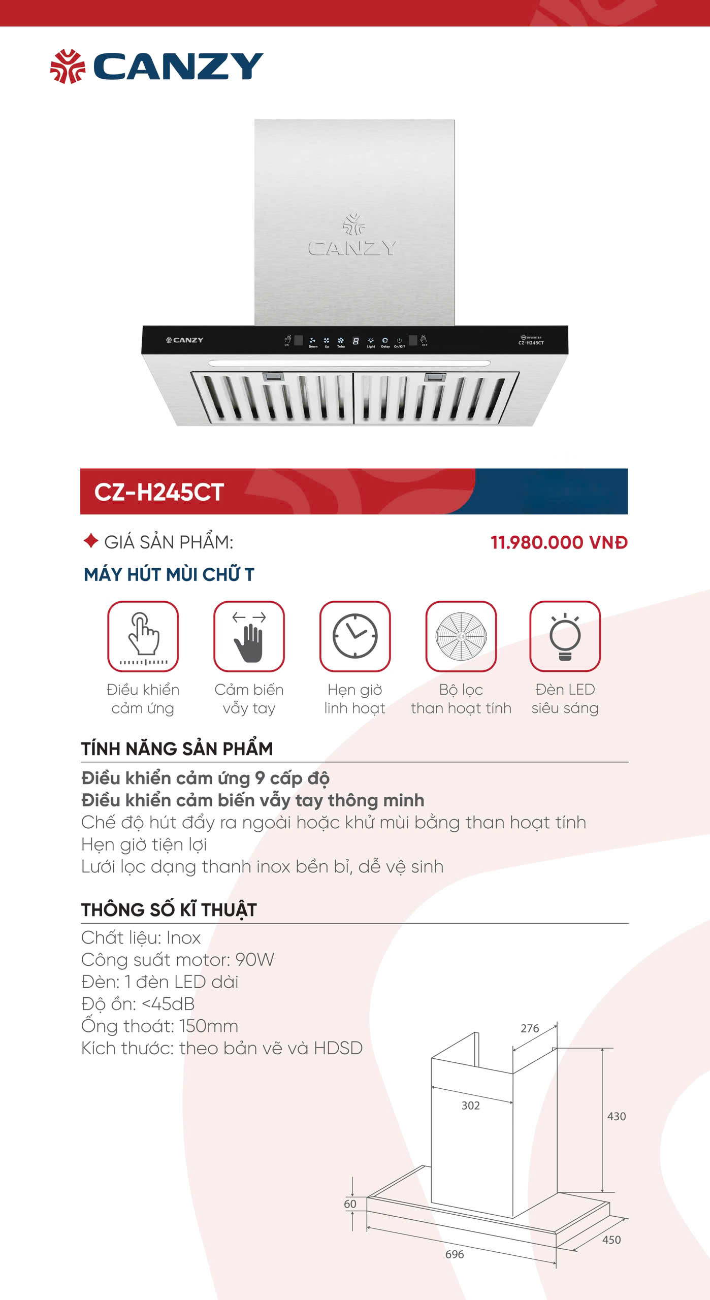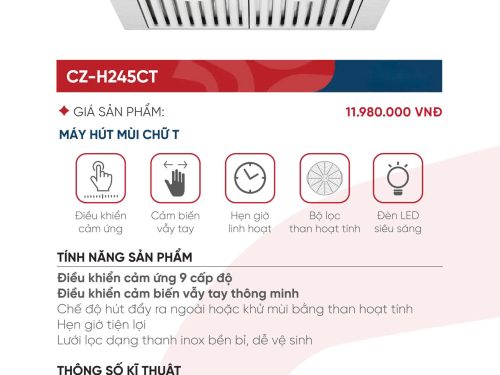 Trong không gian bếp hiện đại, một chiếc máy hút mùi chữ T không chỉ cần hiệu quả mà còn phải vận hành êm ái và dễ điều chỉnh. Máy hút mùi Canzy CZ-H245CT mang đến trải nghiệm sử dụng tối ưu với điều khiển cảm ứng 9 cấp độ, kết hợp cảm biến vẫy tay thông minh, giúp người dùng linh hoạt trong mọi nhu cầu nấu nướng.