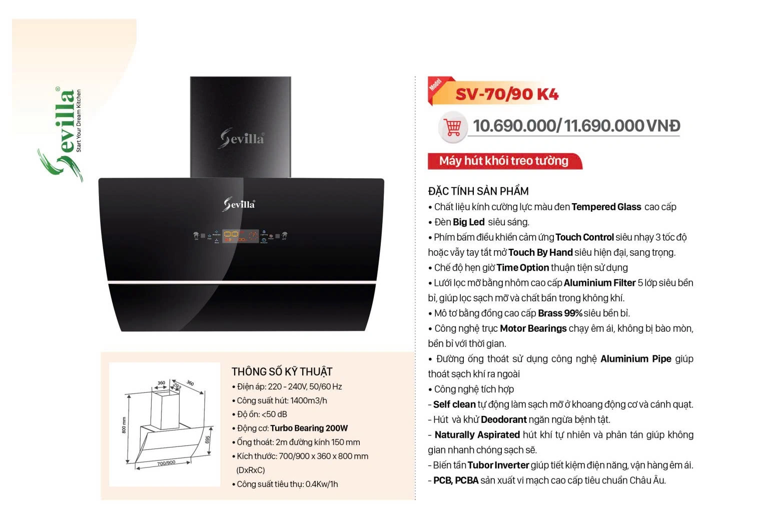 Máy Hút Mùi Sevilla SV 70K4 – Hút Mùi Cảm Biến Vẫy Tay