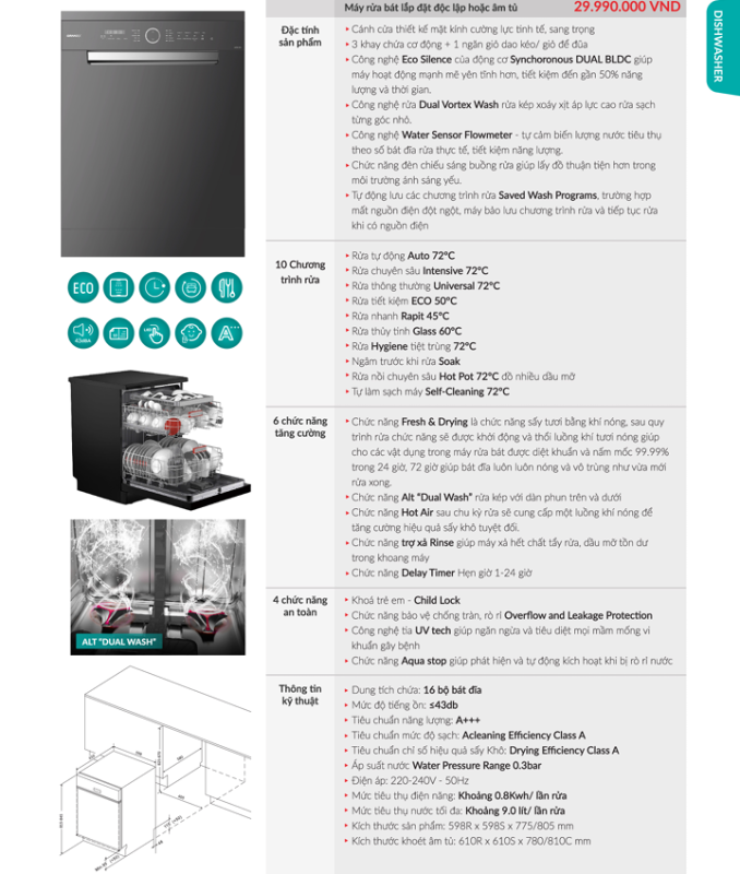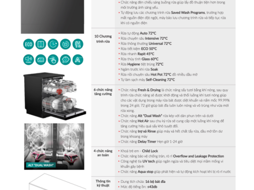 sản phẩm dễ dàng đáp ứng mọi nhu cầu sử dụng từ gia đình đông người cho đến những bữa tiệc nhỏ. Hơn thế, máy còn được trang bị các chức năng tăng cường như Fresh & Drying và Alt “Dual Wash”, đảm bảo sau chu trình rửa, luồng khí nóng được thổi qua giúp diệt khuẩn, ngăn nấm mốc và giữ cho bát đĩa luôn nóng, sạch như vừa mới rửa.
